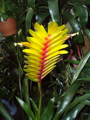 گل وریزیا مشخصات: اسم علمی این گیاه Vriesia splendens ، از خانواده Bromeliaceae میباشد. این جنس دارای 190 گونه، از گیاهان چندساله گلخانه ای زینتی است گل آذین گونه های مختلف ، گوناگون با حالت های مورب یا افقی می باشد. به طور كلی گونه هایی كه دارای گلهای زرد هستند، در روز به گل می روند وآن هایی كه گلهای سفید دارند، در شب گل می دهند گونه مذكور، بومی گینه است و ارتفاع آن به حدود 45 سانتی متر می رسد. گیاه وریزیا حالت روزت دارد و شامل برگهای سبز تیره با لكه ای عرضی ارغوانی تیره می باشد. گلهای این گیاه شمشیر مانند بوده و دم گلی در حدود 60 سانتی متر دارد كه نصف آن شامل گل آذین سنبله با براكته های قرمز و گلهای زرد است. گلها در اواخر تابستان ظاهر می شوند. نور مورد نیاز گیاهانتان را با چراغ رشد گیاه تامین نمایید. مراقبت: وریزیا به نور متوسط، حرارت زیاد، خاك همیشه خیس، رطوبت 70تا 90 درصد و خاك اسیدی احتیاج دارد. کود: كود مورد نیاز این گیاه را میتوان به میزان یك گرم در لیتر، هر سه هفته یكبار، مصرف نمود. كود نباید به قسمت میان گیاه داده شود. خاک: مخلوطی از خاك برگ و خرده آجر برای زهكشی خوب، خاك مطلوب وریزیا است. ازدیاد گل وریزیا: این گیاه با روش كاشت بذر تكثیر میشود. بذرها را به صورت پراكنده در سطح كمپوست مخصوص بذر و قلمه، بكارید. خاك را مرطوب كرده و ظرف را با كیسه پلاستیكی شفاف و یا شیشه بپوشانید دمای محیط باید در حدود 27 درجه سانتیگراد ثابت بماند تا بذر ها 3 هفته بعد جوانه بزنند. بعد از ظهور جوانه ها می توانید دمای محیط را كمی پایینتر بیاورید. زمانی كه نهالهای بذری 6 تا 8 برگ تولید كردند. آنهارا بیرون آورده وهر یك را در گلدانی با قطر دهانه 6 سانتیمتر وكمپوست مخصوص و گیاهان خانواده آناناس و یا كمپوست گلدانی با پایه پیت بكارید. شما می توانید وریزیا را پس از گلدهی، با جدا كردن پاچوشهای آن نیز تكثیر كنید.